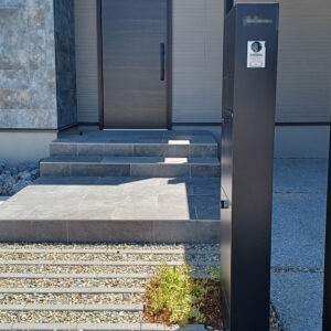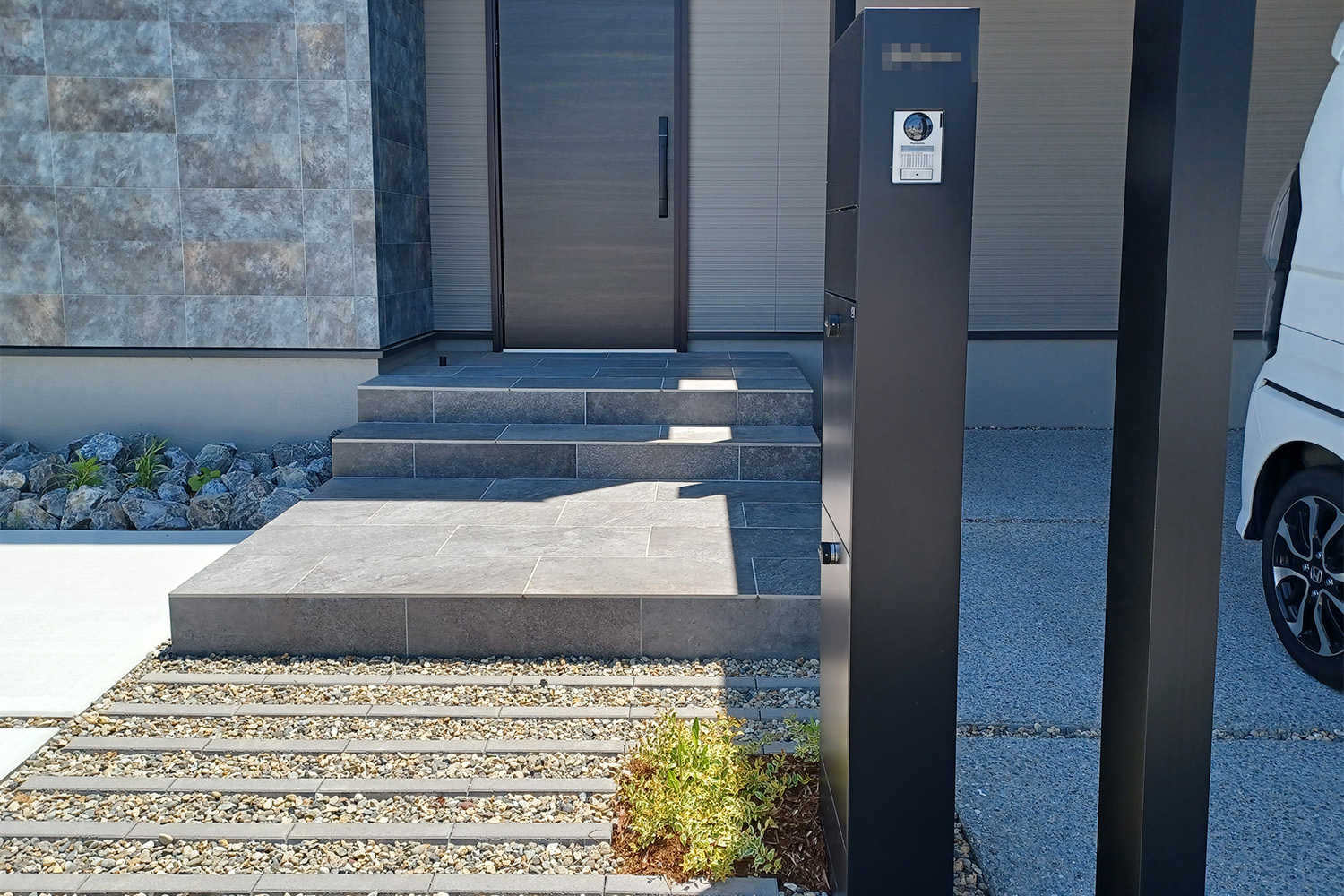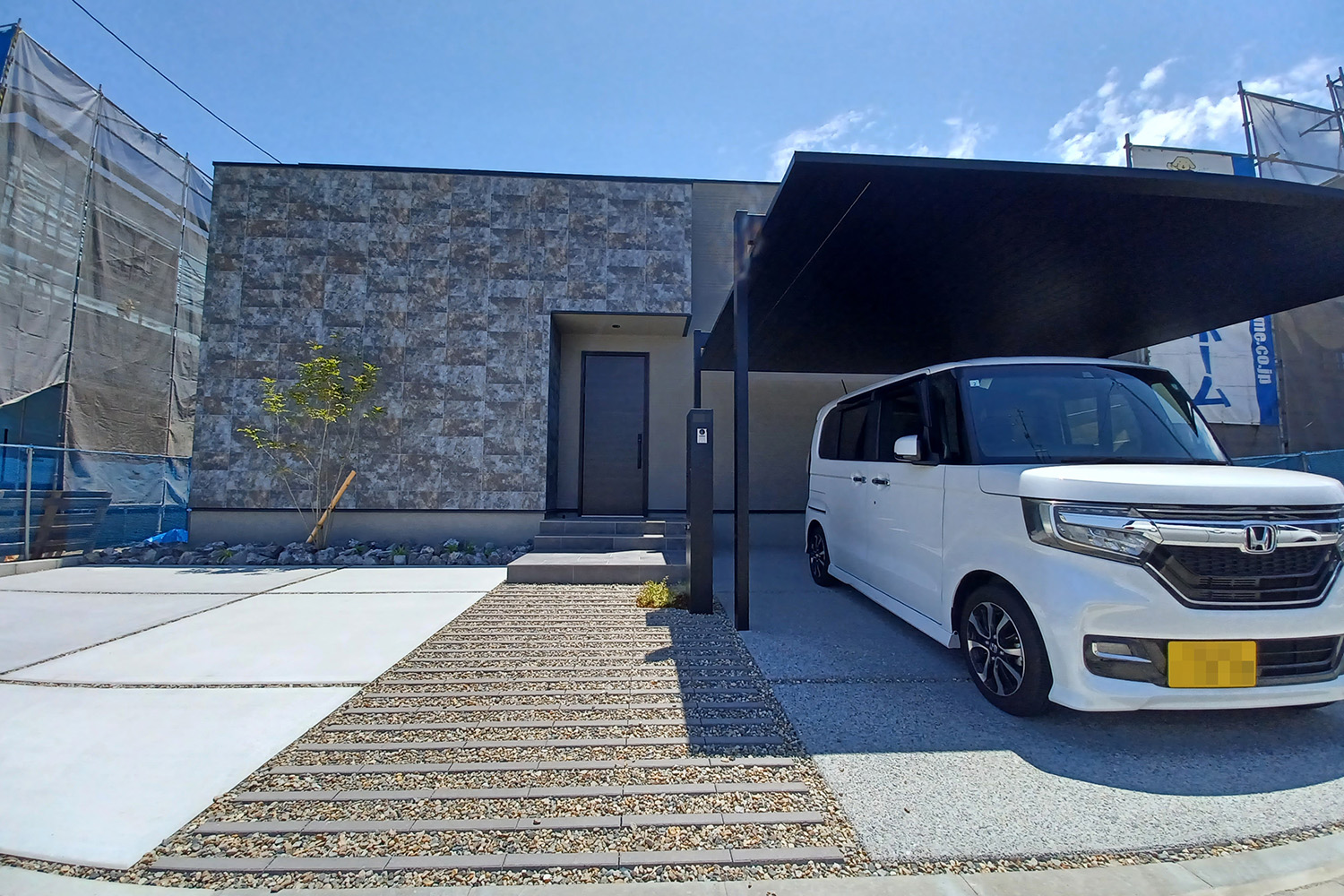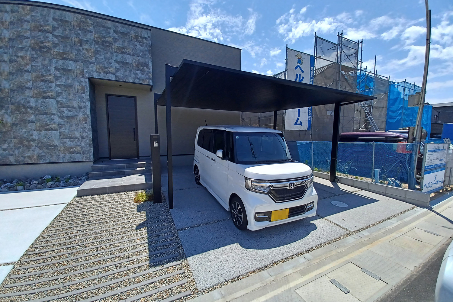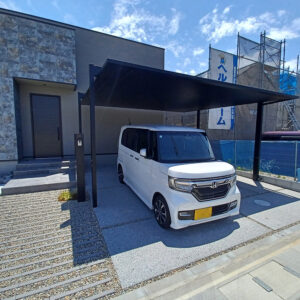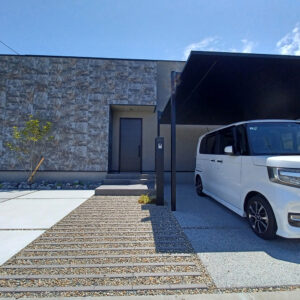 フラットなデザインが建物と調和するカーポートとお庭を施工