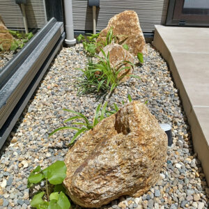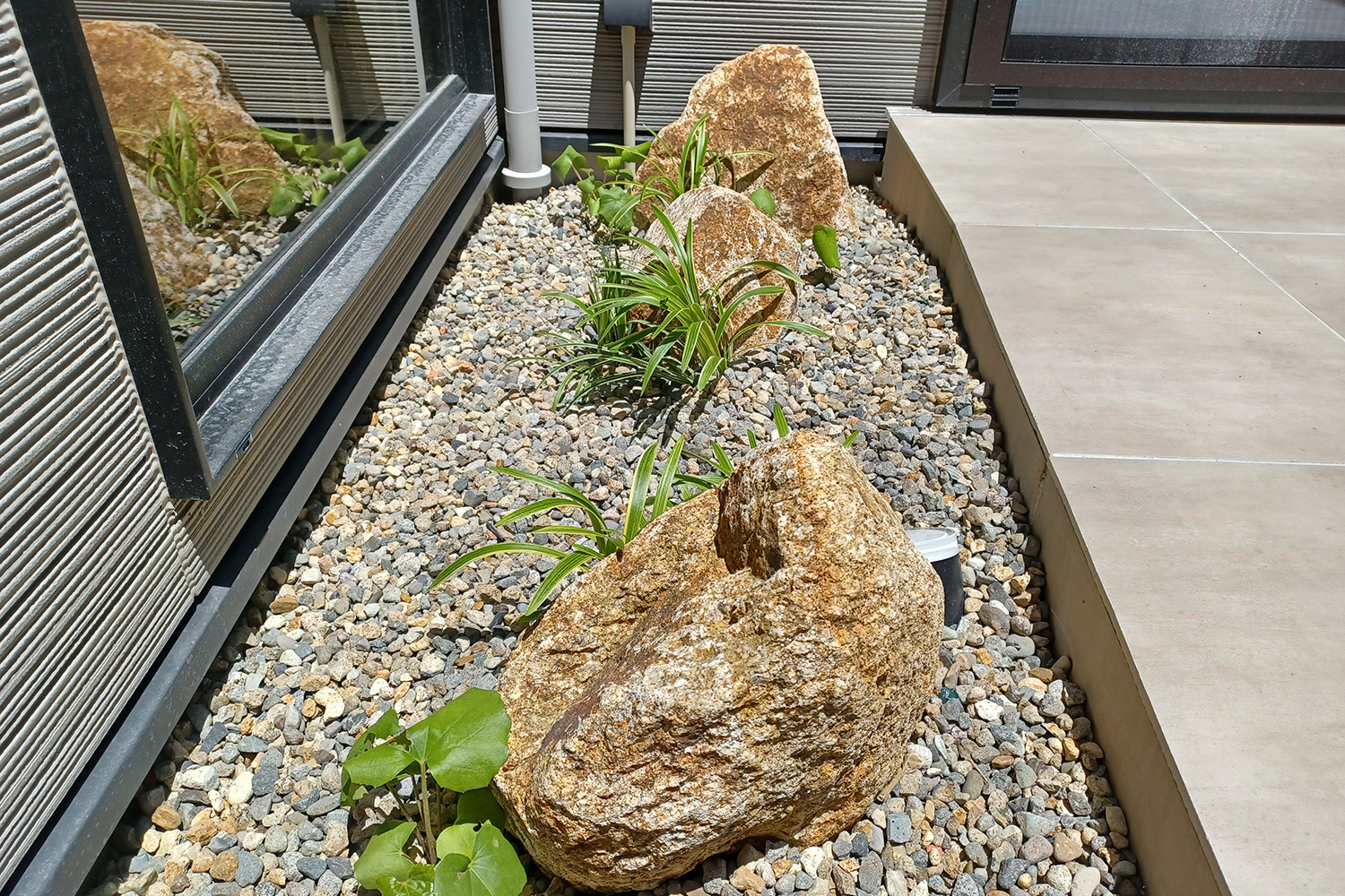 また中庭には、のびのびと過ごせるタイルテラスを施工したほか、玄関からも見渡せる植栽スペースに照明を設置することで、ライトアップされた夜の雰囲気も楽しめます。