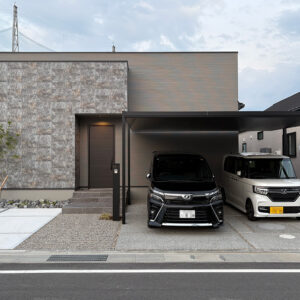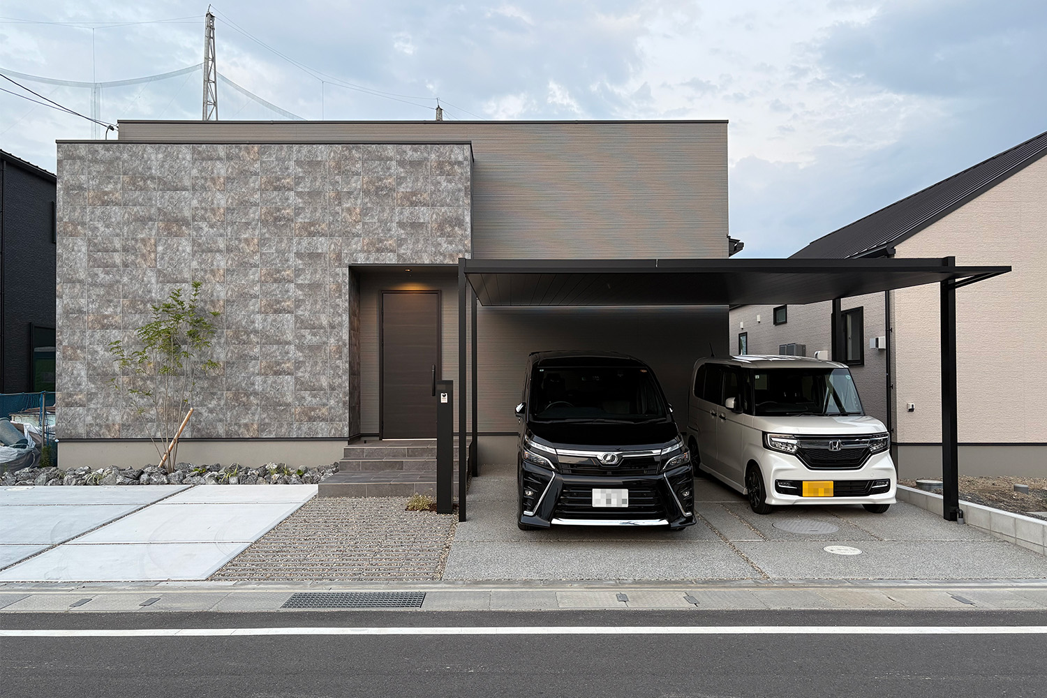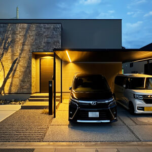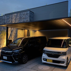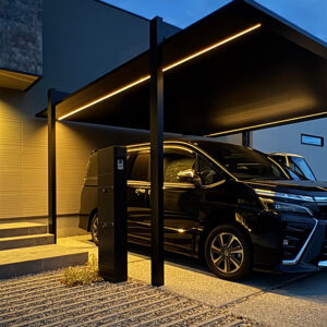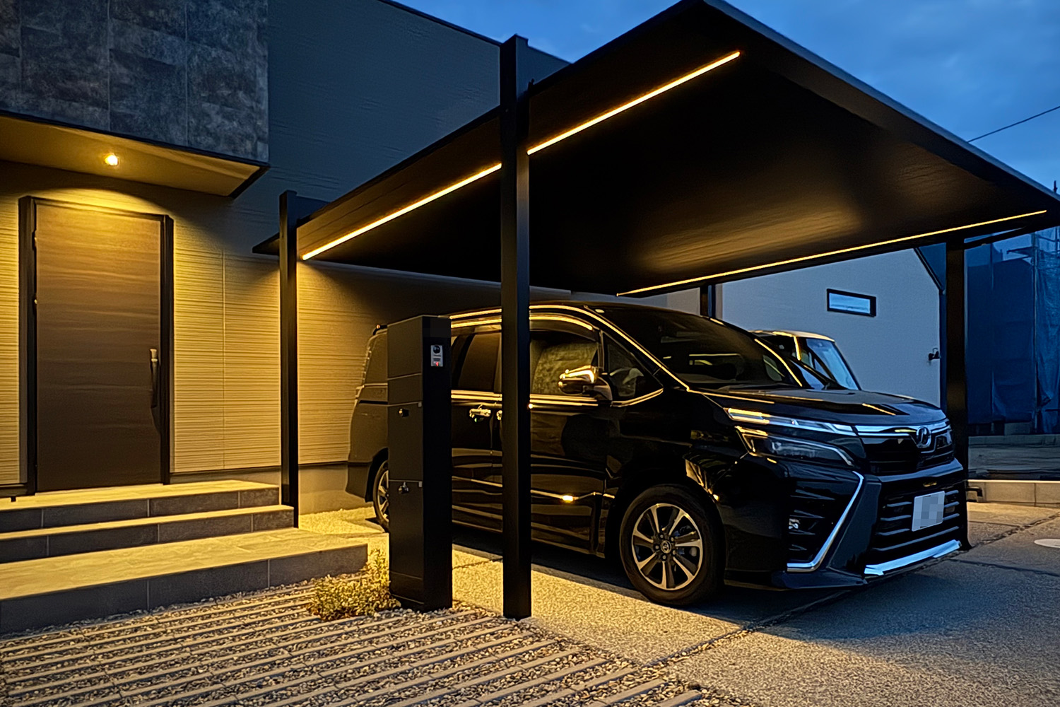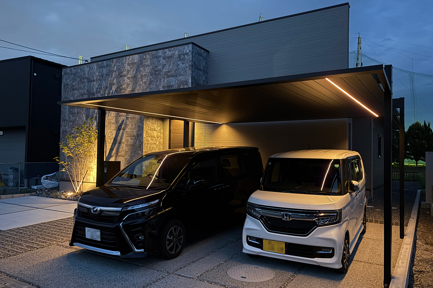 フラットデザインが目を惹くカーポート、三協アルミのFⅡを施工。屋根部分にラインライトを仕込むことで、夜間の駐車をエスコートしてくれるほか、直線的な意匠がより際立つデザインです